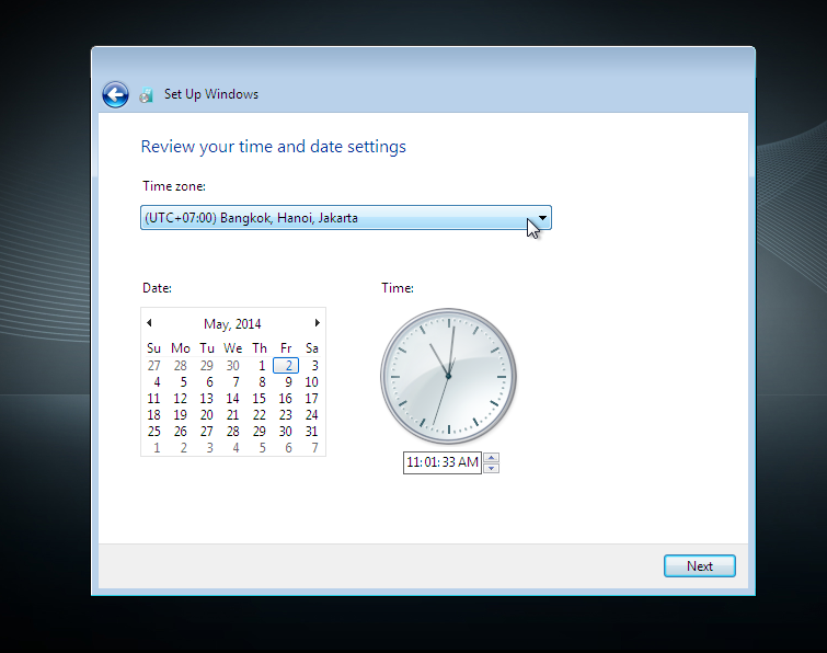 theo bạn cần phải thiết lập múi giờ (Time Zone) cho phù hợp sau đó click Next.