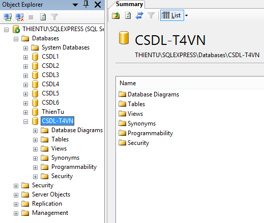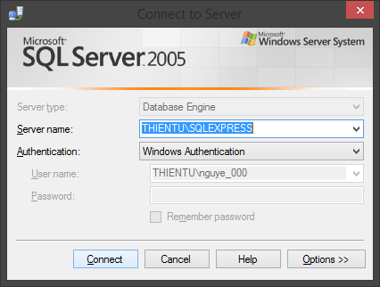 Bước 2: Connect vào Sever name, ở đây mình dùng tên: THIENTU\SQLEXPRESS.